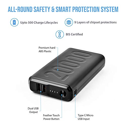 Dual USB Input via Type C / Micro USB at 5V/2.1A, Portable ergonomic design with hard ABS Plastic exterior, Feather touch power button at the top, simply touch the surface to turn on the device ,High Quality Chipsets with 9 Layer of Advanced Protection