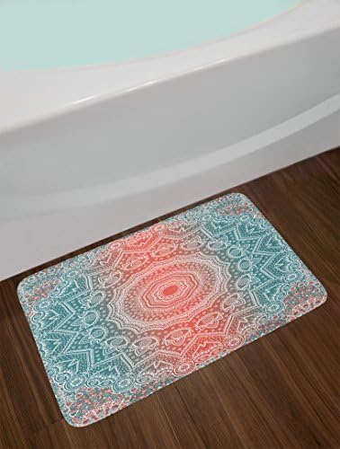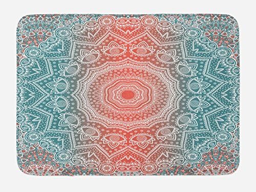 Ambesonne Coral and Teal Bath Mat, Modern Tribal Mandala Tibetan Healing Motif with Floral Geometric Ombre Art, Plush Bathroom Decor Mat with Non Slip Backing, 29.5" X 17.5", Coral Teal