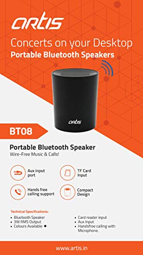 Wireless Bluetooth Speaker with Aux input, Micro SD Card Reader, Mic. For hands-free calling. Plastic body with Top Firing 3W RMS speaker, Dynamic Sound Effect with Crystal Clear Sound Playback. 10 Meters operating Range, Upto 3-4 Hours of Playback Time, 20 Hours Stand by time, Rechargeable 400mAh Battery for extended usage. TF Card Slot, Aux in, Hands-free Calling and LED light indicator. In the box: 1 x Speaker, 1 x Micro USB Charging Cable, 1 x User Manual. 40Mm 3W driver. Charges in 2 hours. Answer, end, reject calls. Listen to music with sound adjustment, previous/next/pause functions. TF card playback support. customer can contact us at 1800 123 8195 for any further assistance