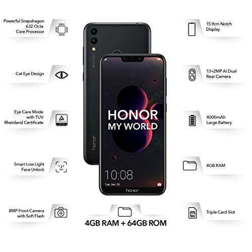 The Honor 8C comes with a 15.9cms (6.26 inches) 19:9 Full View Notch Display for Immersive video playing and gaming experience. It is equipped with 4000mAh battery providing up to 2 days backup on Full charge. Honor 8C is powered by Qualcomm Snapdragon 632 chipset, with 4GB RAM + 64GB storage. It runs on Android 8.0 Oreo out of the box, with Huawei‘s EMUI 8.2 skin on top. It has a 13+2MP dual AI camera with features like AI screen recognition and better low-light photography