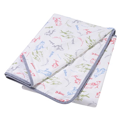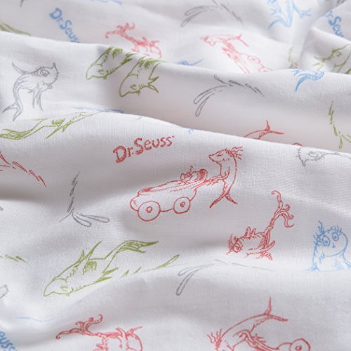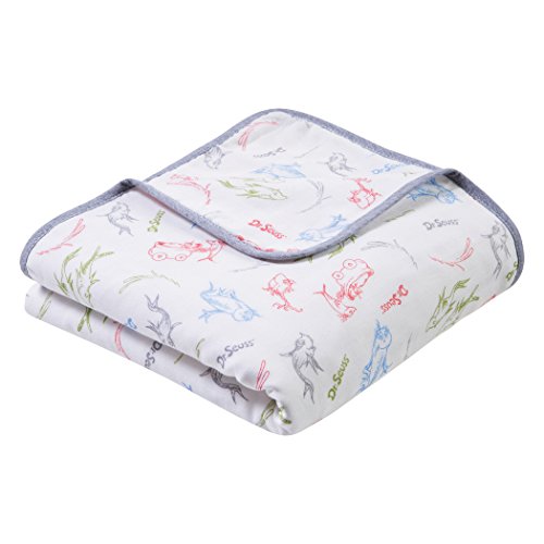 Dr. Seuss New Fish by Trend Lab Luxe Muslin Blankets offer the perfect amount of breathable warmth and softness to keep baby nice and cozy. This soft 100% cotton blanket is a deluxe depth with four layers of our luxe soft muslin. Blanket features Dr. Seuss’ One Fish, Two Fish, Red Fish, Blue Fish characters outlines in a scatter print of deep gray, barn red, fern green, banana cream yellow and sky blue on a creamy white background. Our multipurpose muslin blankets are generously oversized measuring 44 inches x 44 inches and are perfect for swaddling, tummy time and on the go nursing coverage. Plus, they get softer with every wash. Additional colors, prints and muslin products by Trend Lab are sold separately.