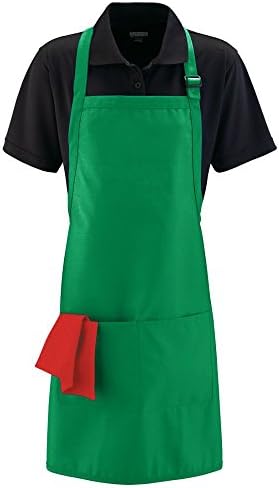 65% polyester/35% cotton twill * 1-inch wide neck strap with slider adjustment * 1-inch wide waist ties, reinforced at stress points * Center-divided patch pocket * Rounded bottom with self-fabric binding * 28″ x 30″