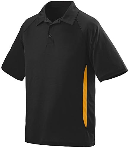 100% polyester wicking textured knit * Wicks moisture * Heat sealed label * Self-fabric collar * Box-stitched placket * Three matching buttons with cross-stitching * Contrast color inserts * Raglan sleeves
