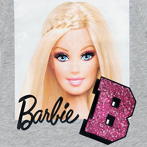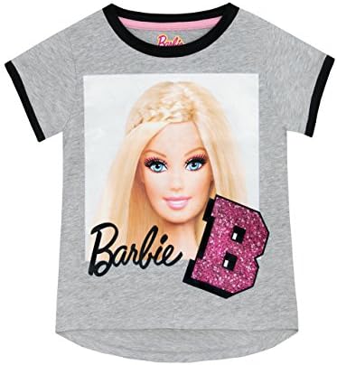 Girls Barbie T-Shirt. Your little one will feel inspired by the most stylish role model around in this glamorous Barbie T-Shirt. A super chic grey short sleeve tee featuring a large print of the famous fashionista: Barbie, and the letter ‘B’ in glamorous pink glitter. This cotton tshirt also has a dipped hem and rolled up sleeves so your own doll will look bang-on-trend!!