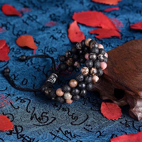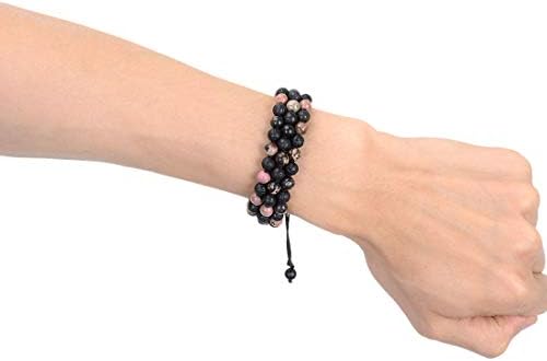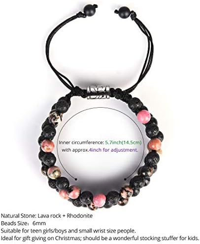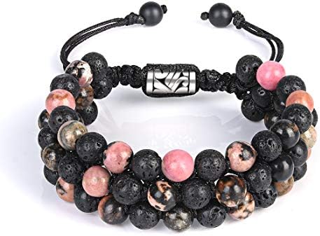 NATURAL BEADS BRACELET: The handmade 3 raw bracelet is made of 10 mm metal silver bead (on the bottom of the bracelet), 6 mm natural Lava Rock (black matte)+ Rhodonite(Pink).