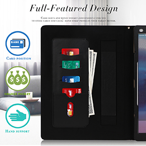 Interior card slots are designed for you to put your business cards/ bank cards/ SD digital card/ SM card. Note holder provides to take some notes or bucks while on the go. Hand strap makes 12.9 inch iPad Pro case easy to carry around and makes it possible for you to hold the tablet with one hand.
