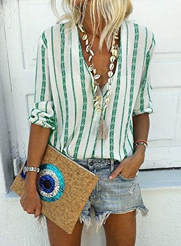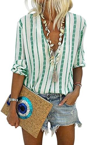 HOTAPEI Womens Casual V Neck Striped Cuffed Sleeve Button Down Collar Blouses Shirts