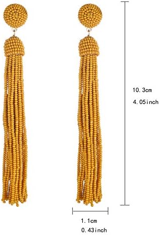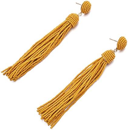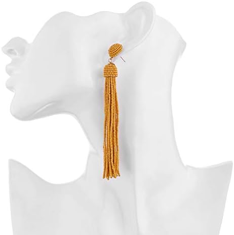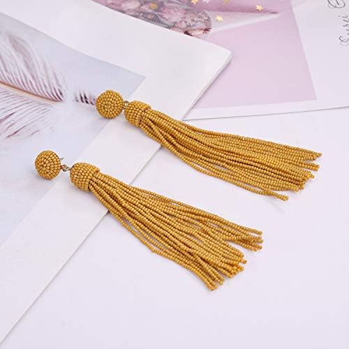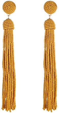 Handcrafted- Our latest statement piece features this beaded drop tassel earrings with beads color mustard yellow and a goldtone finish clipon fashion accessories