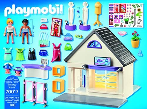 Enjoy some window shopping and check out all the gorgeous outfits at My Fashion Boutique They have the latest fashion trends on display in the front window and throughout the store ready for you to try one Select a stylish new piece and head to the fitting room to try it on with matching accessories For even more fun combine this set with the rest of the PLAYMOBIL My Town theme world (#70014-70016 sold separately)! Set includes two figures boutique cash register interchangeable clothing mannequins hats hand bags bracelets watches and many other accessories Dimensions 10 2 x 13 x 10 6 in (LxWxH) Recommended for ages four years and up Warning Choking Hazard Small parts Not for children under 3 years