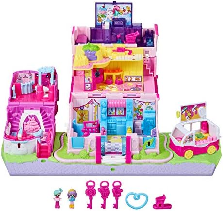 Use your key to unlock the secret small Mall! Playset includes a 3 level Supermarket, a 2 level fashion Boutique and a cool scoops ice cream truck!