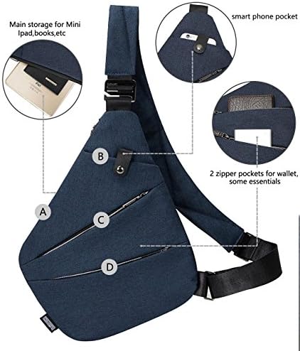 ✔Multiple Storage Purpose Sling Bag: 1 roomy main zippered pocket (A area) with small inner pouches to safely store and organize your kindle, IPAD mini, camera, umbrella, keys, small snacks, water bottle, or so on. 1 front magnetic snap phone pocket(B area), 2* front zipper pockets can hold things such as power bank/passport/purse (C area), business cards/cash and change (D area)