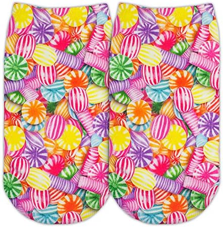 Includes 1 pair of girls printed food and candy socks. Select from cheeseburger/hamburger, cupcake, french fry, pepperoni pizza, runts candy, rainbow sprinkles, or mint swirl hard candy designs. Novelty socks are the latest fashion trend among little girls, tweens, big girls, and teens.