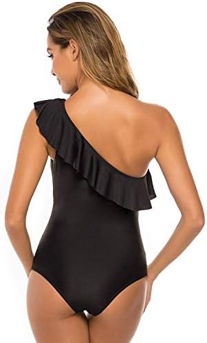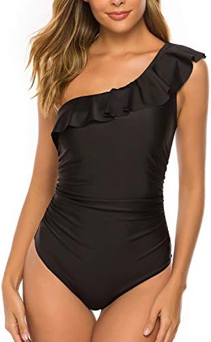 👙【Special Design & Free Gift】: This black one piece swimsuit come with cute and supportive asymmetric one shoulder ruffle strap, the off the shoulder look is sexy and charming. The swimwear also come with a free waterproof phone case gift (the color is random to ship).